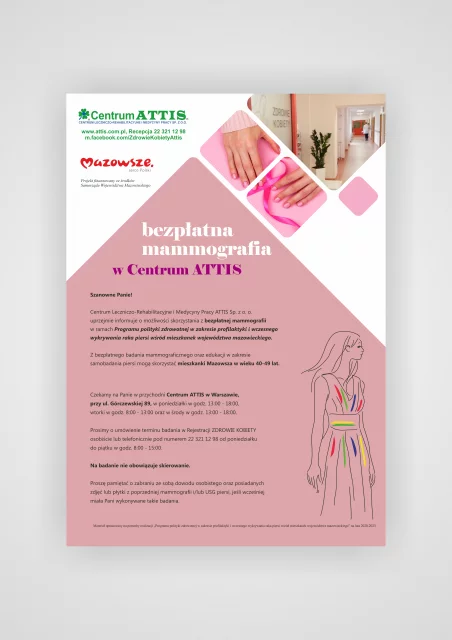 Centrum Leczniczo-Rehabilitacyjne i Medycyny Pracy ATTIS Sp. z o. o. uprzejmie informuje o możliwości skorzystania z bezpłatnej mammografii w ramach Programu polityki zdrowotnej w zakresie profilaktyki i wczesnego wykrywania raka piersi wśród mieszkanek województwa mazowieckiego.
