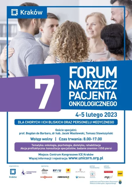 Celem wydarzenia jest stworzenie przestrzeni do spotkania Pacjentów onkologicznych, ich rodzin, personelu medycznego różnych specjalności, studentów, a także instytucji i organizacji, które aktywnie pomagają osobom dotkniętym problemem choroby nowotworowej. Tegoroczne Forum na Rzecz Pacjenta Onkologicznego rozpocznie się częścią warsztatową (warsztaty dotyczące psychologii, dietetyki, rehabilitacji, medycyny), a od 11.30 do 17.00 zaplanowana jest sesja główna. W trakcie trwania wydarzenia odbędzie się akcja profilaktyczna – chętne osoby będą mogły zbadać znamiona, wykonać USG piersi oraz skorzystać z konsultacji ze specjalistami. Udział jest bezpłatny, obowiązują ZAPISY. Zobacz PROGRAM wydarzenia. Organizatorem spotkania jest Stowarzyszenie UNICORN oraz Prezydent Miasta Krakowa. Wydarzenie pod Patronatem Honorowym Rektora Uniwersytetu Jagiellońskiego. Portal onkologiczny Zwrotnik Raka sprawuje patronat medialny.