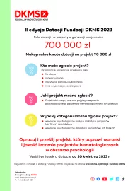 Fundacja DKMS to nie tylko Ośrodek Dawców Szpiku, ale również organizacja, która działa na rzecz poprawy warunków i jakości leczenia pacjentów walczących z nowotworami i chorobami układu krwiotwórczego. Uruchomiony w 2022 r. pilotaż projektu „Dotacja Fundacji DKMS” spotkał się z dużym zainteresowaniem NGO’sów zajmujących się pacjentami hematologicznymi i ich najbliższymi – zgłoszono 18 projektów, a 6 z nich otrzymało dotację. Obecnie startuje 2. edycja „Dotacji Fundacji DKMS”, w której łączna pula środków może wynosić nawet 700 000 zł. Termin na zgłaszanie projektów mija 30 kwietnia br.